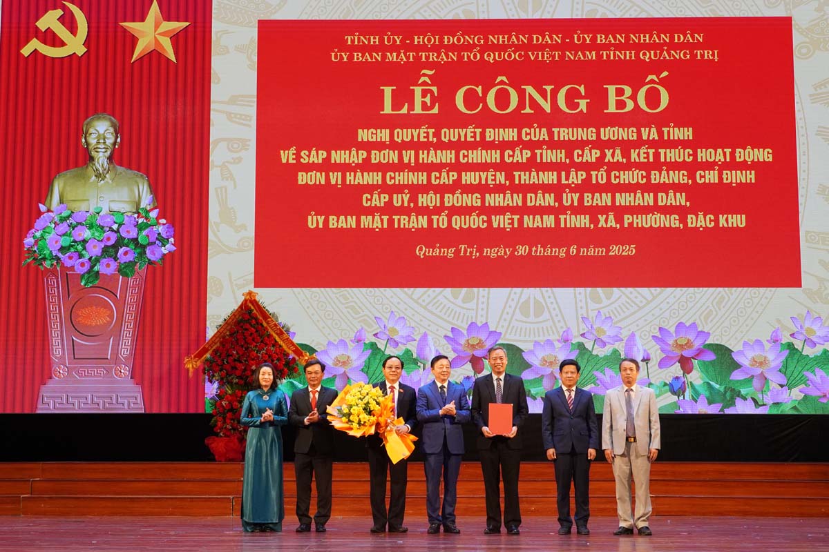 (Quang Binh Portal) - Sáng ngày 30/6/2025, tại Trung tâm Văn hóa - Điện ảnh tỉnh Quảng Bình, Tỉnh ủy, HĐND, UBND, Ủy ban MTTQVN hai tỉnh Quảng Bình, Quảng Trị long trọng tổ chức lễ công bố các Nghị quyết, Quyết định của Trung ương và tỉnh về sáp nhập đơn vị hành chính cấp tỉnh, cấp xã, kết thúc hoạt động đơn vị hành chính cấp huyện, thành lập tổ chức Đảng, chỉ định cấp ủy, HĐND, UBND, Ủy ban MTTQ Việt Nam tỉnh và xã, phường, đặc khu thuộc tỉnh Quảng Trị (mới). Phó Thủ tướng Chính phủ Trần Hồng Hà dự và chỉ đạo lễ công bố.