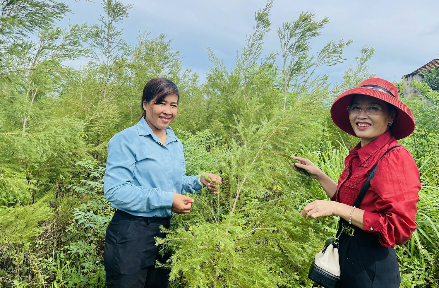 Chị Như Oanh (trái) bên rừng cây tràm trà đang được thu hoạch vụ đầu tiên.