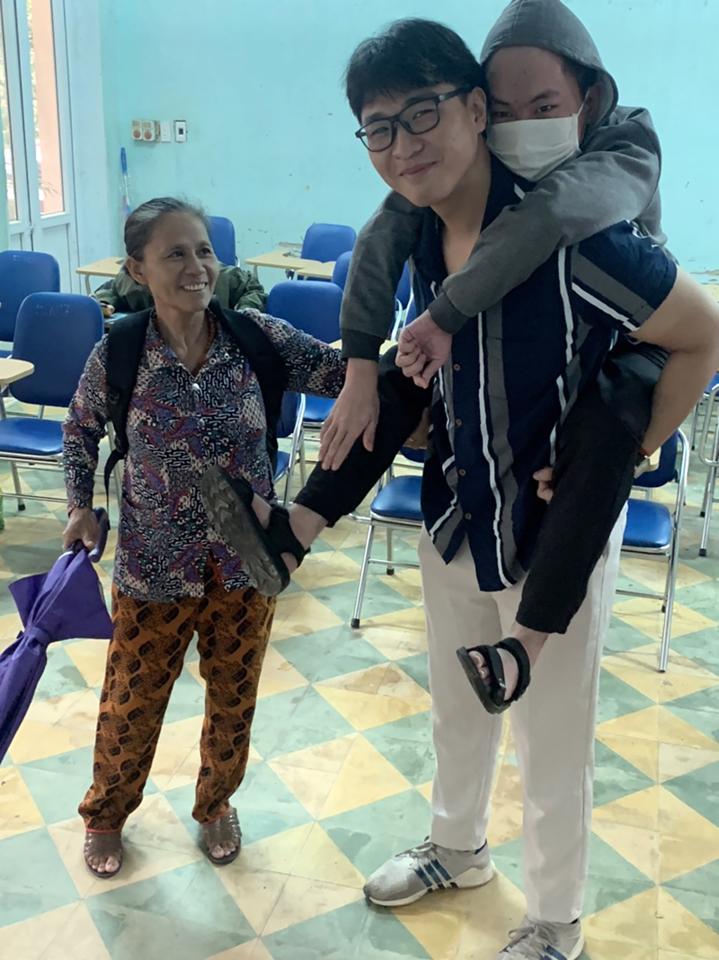Bây giờ, mỗi buổi sáng, các bạn ở ký túc xá thay nhau cõng Thắm lên giảng đường. Chị Hồng, với vóc người nhỏ bé so với cậu con trai 19 tuổi và các bạn của con, yên tâm đi bên cạnh và tự hào khoe về những sinh viên tốt bụng đang giúp con mình, trong đó có các sinh viên Lào. Không muốn làm phiền mọi người nhiều, mỗi buổi học, chị vẫn kiên nhẫn chờ con trước cửa lớp để giúp con trong sinh hoạt cá nhân. Cũng bởi những bất tiện đó, mẹ con chị được nhà trường bố trí riêng một phòng để thuận lợi hơn trong việc chăm sóc, sinh hoạt.