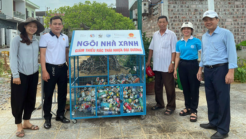 Chị Nguyễn Thị Hồng Vân (áo xanh) với mô hình “Biến rác thành tiền”