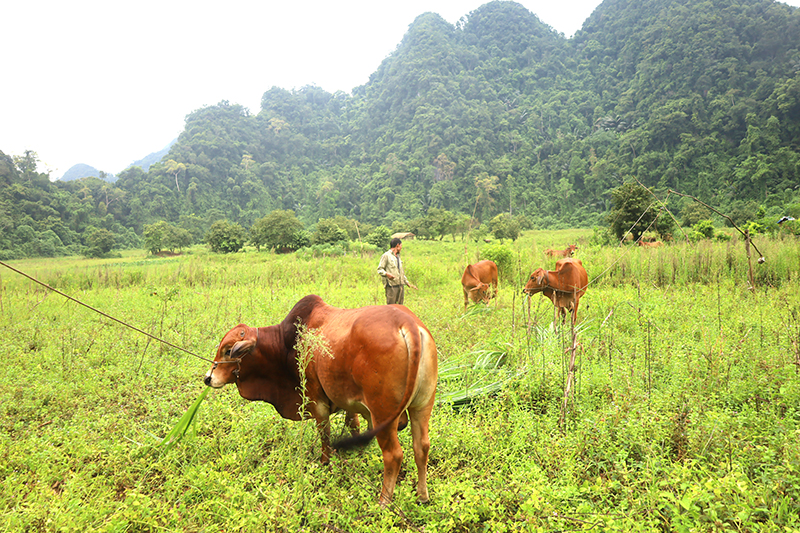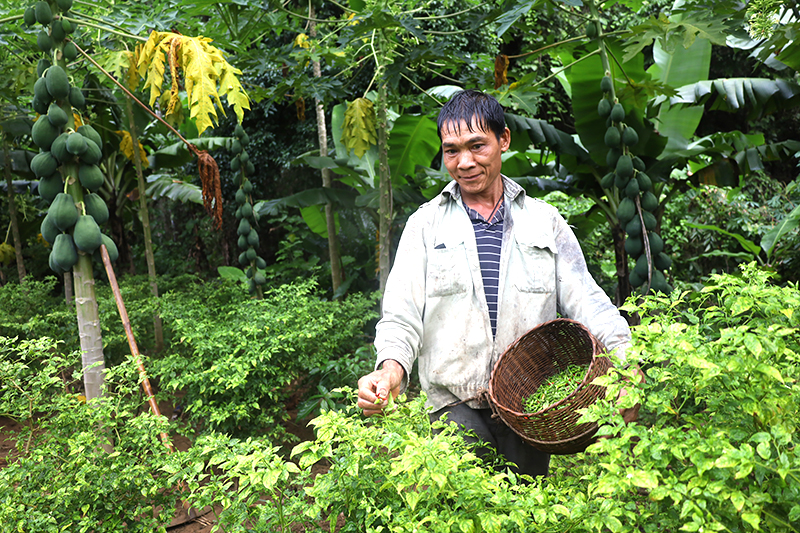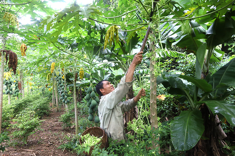 Ông Đinh Sơn Tình chia sẻ: Các loại cây mà vợ chồng ông lựa chọn trồng quanh chân lèn, hiện đều đang phát triển rất tốt, cho hiệu quả cao. Cụ thể, quanh chân lèn này, gia đình đã trồng được vài trăm bụi chuối, hơn 300 cây đu đủ (chủ yếu là cây đu đủ đực để lấy hoa bán ra thị trường), chừng 1.000 mét vuông đất trồng giống ớt bản địa, khoảng 100 gốc cây ăn quả (chủ yếu là cam, bưởi), 50 gốc tiêu, khoảng 1,5ha lạc, 500 mét vuông đất trồng cỏ phục vụ phát triển chăn nuôi.