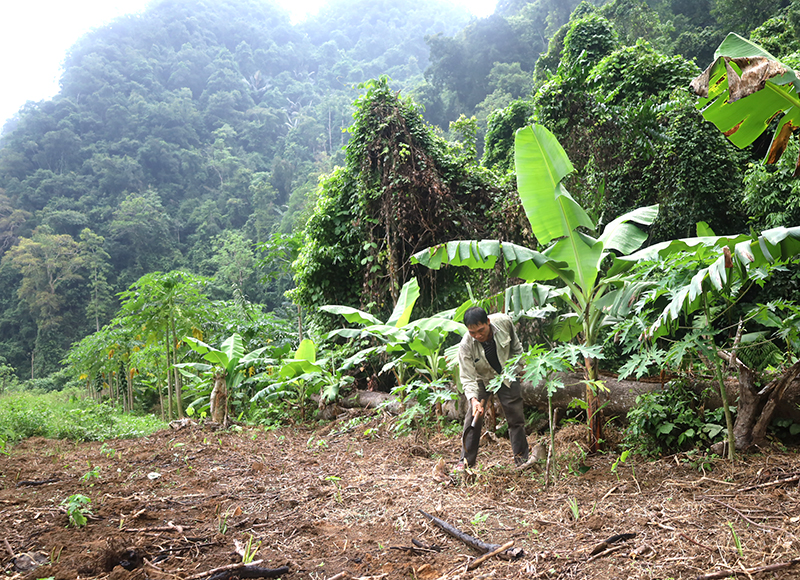 Ông Đinh Sơn Tình trồng cây ăn quả quanh lèn đá của thung lũng Tà Vờng.