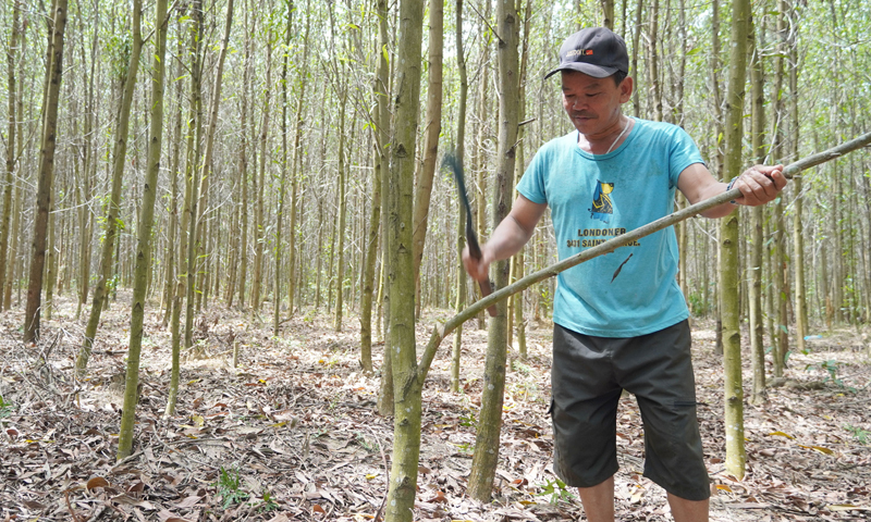 Ông Hồ Văn Thảo chăm sóc rừng keo của gia đình.