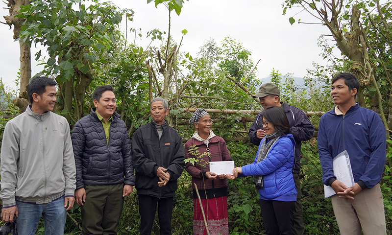 Cán bộ Trung tâm Bảo tồn Thiên nhiên Việt khen thưởng hộ dân bản Cổ Tràng đã trồng và chăm sóc cây hiệu quả.