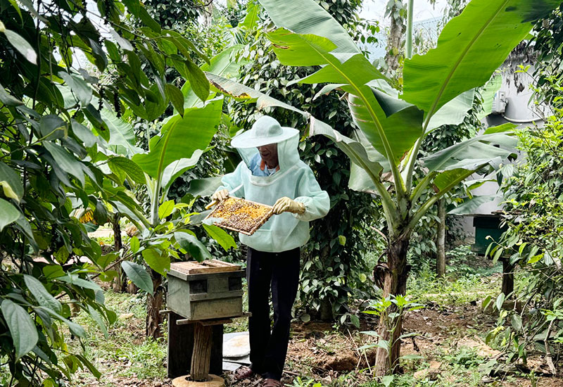 “Năm 2021, gia đình tôi cùng một số hộ dân ở thôn Bồng Lai 2 được nhận hỗ trợ 30 đàn ong từ VQG PN-KB, riêng gia đình tôi được hỗ trợ 4 đàn ong. Sau khi nhận được hỗ trợ sinh kế, tôi đã được cán bộ VQG PN-KB hướng dẫn kỹ thuật nuôi ong lấy mật. Từ 4 đàn ong được hỗ trợ, nay, tôi đã phát triển mô hình thành 12 đàn ong. Mỗi năm, đàn ong của gia đình cho thu hoạch khoảng 100 lít mật ong, tạo thu nhập đáng kể…”, ông Hòa cho hay.