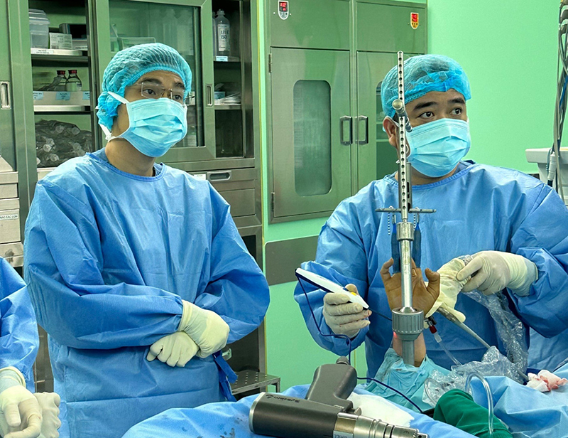 Bác sĩ Trần Nguyễn Phương cùng đồng nghiệp đang phẫu thuật nội soi.