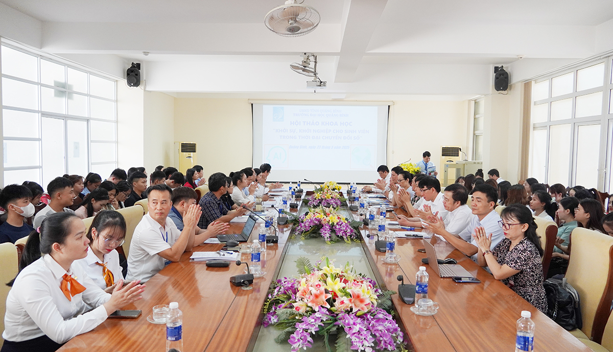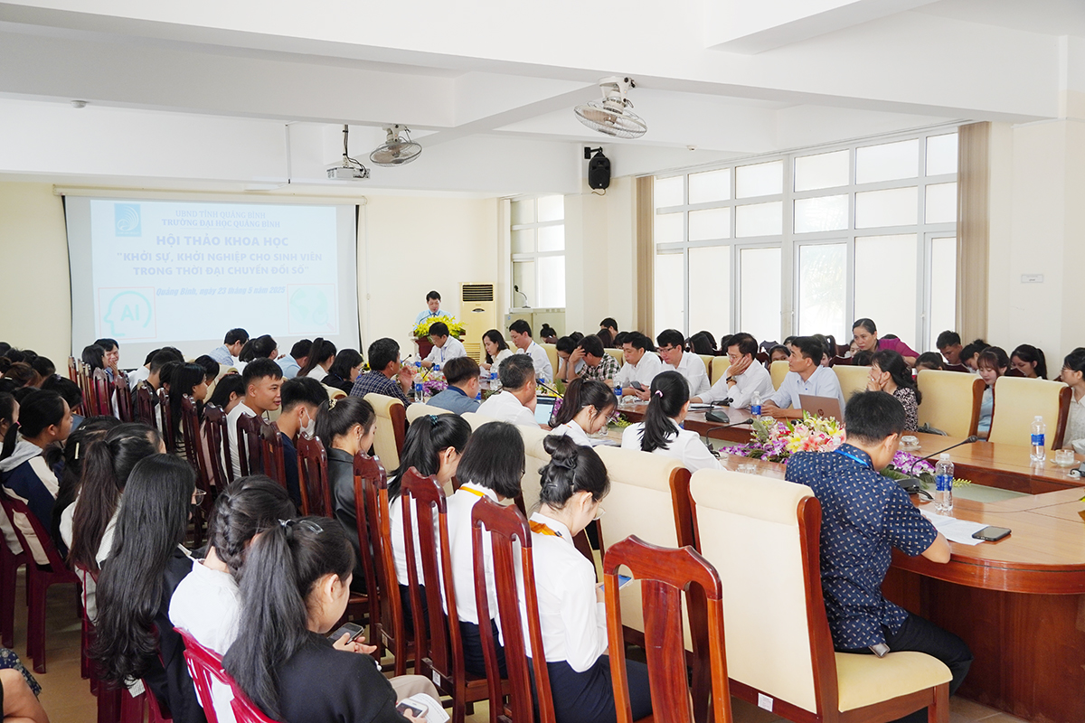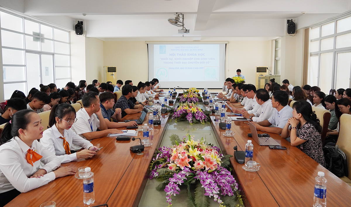 (Quang Binh Portal) - Sáng ngày 23/5/2025, Trường Đại học Quảng Bình tổ chức Hội thảo khoa học với chủ đề: "Khởi sự, khởi nghiệp cho sinh viên trong thời đại chuyển đổi số" nhằm nâng cao nhận thức, bồi dưỡng năng lực khởi nghiệp cho sinh viên, đặc biệt là trong bối cảnh cuộc Cách mạng công nghiệp lần thứ tư đang diễn ra mạnh mẽ.