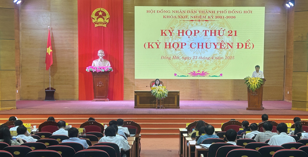 (Quang Binh Portal) - Ngày 23/4/2025, HĐND thành phố Đồng Hới khóa XXII, nhiệm kỳ 2021 - 2026, tổ chức kỳ họp thứ 21 (kỳ họp chuyên đề) để thông qua chủ trương sắp xếp đơn vị hành chính cấp tỉnh, cấp xã và một số nội dung khác.